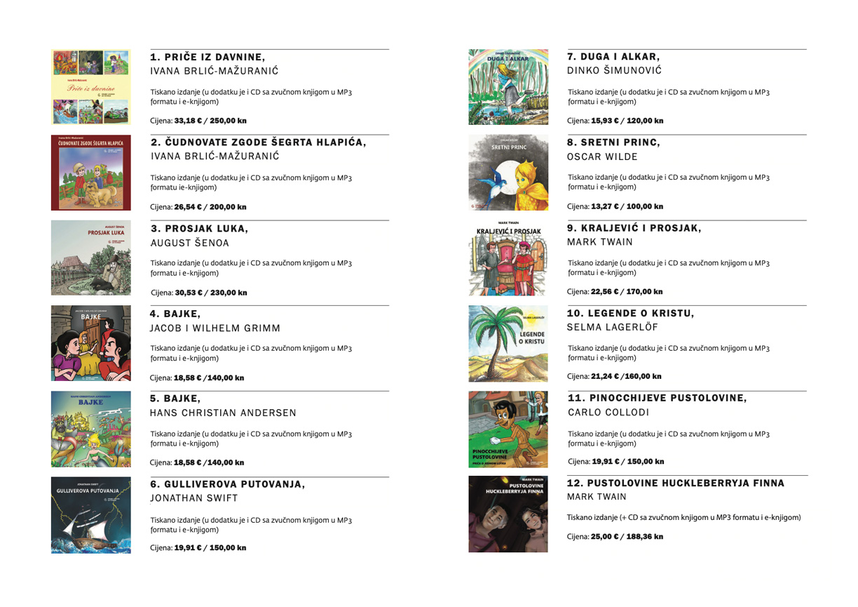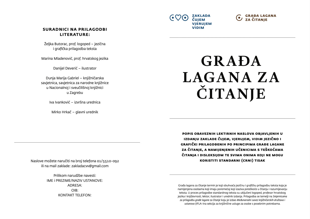 Programom Čujem, vjerujem, vidim omogućava se na godišnjoj razini dostupnost novih 60-100 zvučnih knjiga slijepim i drugim osobama koje ne mogu koristiti standardni tisak. Žanrovski je tu riječ o pjesničkim, proznim i književno-esejističkim djelima, posebno djelima suvremenih domaćih i stranih autora, popularno-znanstvenim djelima, knjigama za djecu i mlade i klasičnim i drugim djelima kršćanske teologije i duhovnosti.